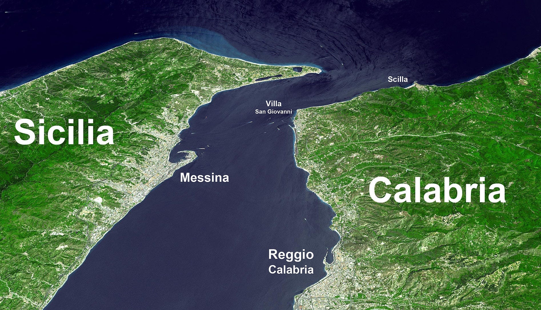 In The Odyssey, Homer placed Scylla and Charybdis on these shores. The strait is home to strong, swift currents and strong winds that have left the seabed peppered with shipwrecks dating back to antiquity.